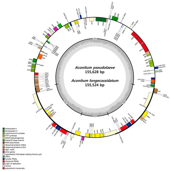 - Park, I.; Kim, W.J.; Yang, S.; Yeo, S.M.; Li, H.; Moon, B.C. The complete chloroplast genome sequence of Aconitum coreanum and Aconitum carmichaelii and comparative analysis with other Aconitum species. PLoS ONE 2017, 12, e0184257. [Google Scholar] [CrossRef] [PubMed]
