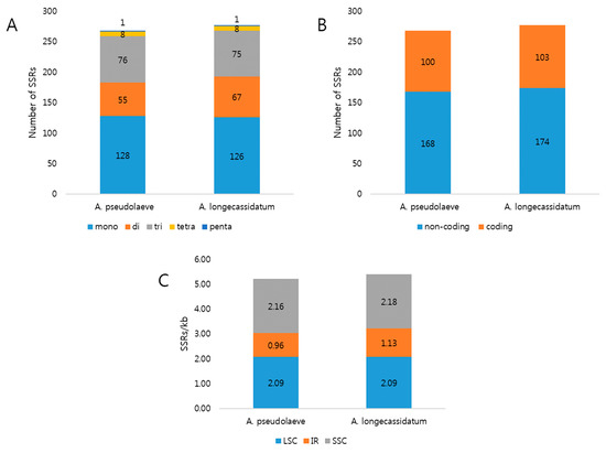 3.3. SSR, Tandem, and Palindromic Repeat Analysis in Two Aconitum CP Genomes