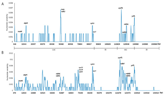 - Kim, K.; Lee, S.C.; Lee, J.; Lee, H.O.; Joh, H.J.; Kim, N.H.; Park, H.S.; Yang, T.J. Comprehensive survey of genetic diversity in chloroplast genomes and 45 s nrDNAs within Panax ginseng species. PLoS ONE 2015, 10, e0117159. [Google Scholar] [CrossRef] [PubMed]