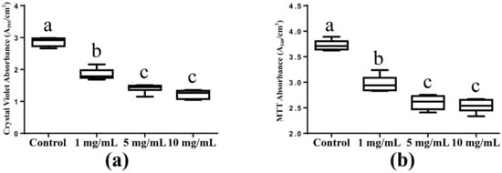 The metabolic activity of the saliva-derived biofilms was revealed in Figure 1b. The metabolic activity decreased from control group and 1 mg/mL group to the 5 mg/mL and 10 mg/mL groups significantly (p < 0.05). Compared with the control group, metabolic activity of 1 mg/mL group decreased significantly (p < 0.05). In addition, the biofilms on the titanium discs coated with 5 mg/mL and 10 mg/mL DMADDM solution showed the same metabolic activity statistically.