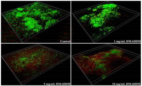 The result of the live/dead bacteria staining was exhibited in Figure 2. More live cells could be detected in the biofilms from control group, rather than the biofilms on DMADDM modified titanium discs. Dead cells were scarcely detected. Compared with the biofilm from 1 mg/mL group, those from 5 mg/mL and 10 mg/mL groups contained more dead cells. Most of the cells in biofilms from 5 mg/mL and 10 mg/mL groups were killed. The results indicated that the higher mass fraction of DMADDM the coating solution had, the higher the rate of dead cells in biofilms was.