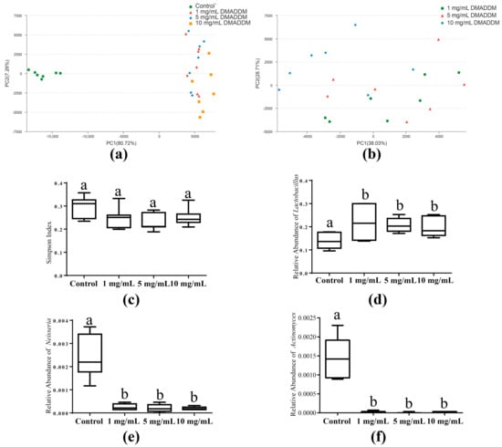 The microbial community of saliva-derived biofilms. (a) Principal component analysis (PCA) score plot of control group (green), 1 mg/mL DMADDM group (red) 5 mg/mL DMADDM group (blue) and 10 mg/mL DMADDM group (yellow); (b) PCA score plot of 1 mg/mL DMADDM group (green) 5 mg/mL DMADDM group (yellow) and 10 mg/mL DMADDM group (blue); (c) Alpha diversity of every group was measured with the Simpson index; (d–f) showed the relative abundance of Lactobacillus, Neisseria, and Actinomyces, respectively. Significant difference can be seen between the bars marked with different letters (a, b) (p < 0.05).