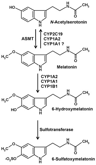 Several of the melatonin-catabolizing CYPs are also expressed in nonhepatic tissues. Although their quantitative contribution to circulating 6-hydroxymelatonin levels and to urinary 6-sulfatoxymelatonin is only minor, local metabolism in other organs may not be entirely irrelevant. This is particularly valid for the central nervous system (CNS). In the brain, the expression of CYP1A2 [14,15,16], CYP1A1 [14,16], CYP1B1 [10,16,17], and CYP2C19 [18,19,20] has been demonstrated. The contribution of the CYP2C19 to melatonin demethylation and that of CYP1B1 to 6-hydroxylation in the brain may be higher than in other tissues [1]. Interestingly, 6-hydroxymelatonin is also sulfated in the CNS [1,21], although the role of 6-sulfatoxymelatonin in the brain as well as its elimination from there has remained entirely unclear [1].