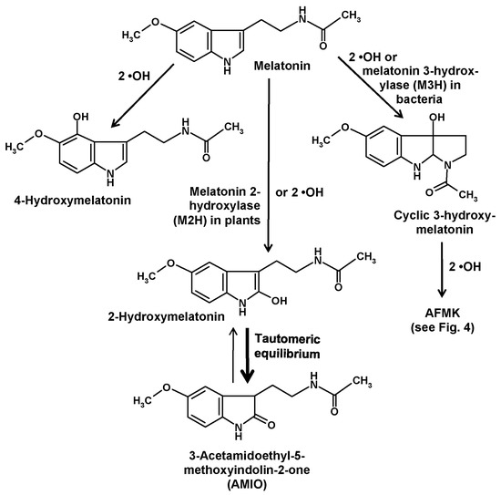The first enzyme that was shown to convert melatonin to AFMK was indoleamine 2,3-dioxygenase (IDO). However, it is important to keep in mind that this enzyme is not specific for melatonin, but rather converts various other indolic compounds, in particular, tryptophan, which is its main substrate. IDO is known to be upregulated by inflammatory signals, such as interferon-γ. The relationship to inflammation is even stronger in the case of myeloperoxidase, which also generates AFMK [91,92]. Under respective conditions, such as inflammation, it was concluded that about 35% of melatonin may enter the kynuric pathway [92]. AFMK formation from melatonin is also possible by other hemoproteins, such as some hemoperoxidases [29] and also cytochrome c [13]. The conversion by cytochrome c may receive more future attention with regard to the recent demonstration of melatonin biosynthesis in mitochondria [93]. Cytochrome c acts via a multi-step mechanism that involves AMIO (see above) and a further intermediate that is mentioned in literature as “2,3-dihydroxymelatonin” [13]. However, this name is, in fact, questionable, since such a compound is chemically inexistent. As already discussed above in the case of the so-called “2-hydroxymelatonin”, which rather tautomerizes almost completely to the respective indolinone, AMIO, this tautomerization has to be considered here even more and with imperative necessity, since a 2,3-dihydroxylated melatonin cannot exist because this would exceed the possible four bond numbers of carbon. Therefore, an additional hydroxylation at ring atom 3 is only possible at the indolinone tautomer, AMIO. As the 2,3-dienol is impossible, the term “2,3-dihydroxymelatonin” is strongly misleading and should be avoided. The intermediate may instead be called 3-hydroxy-AMIO or 3-OH-AMIO. Regardless of whether the preceding intermediate, AMIO, is formed by cytochrome c, or by two •OH or, in plants, by M2H, free AMIO can, of course, also be converted to 3-hydroxy-AMIO by two additional •OH (Figure 4). A look at the structural formulas immediately shows that the 3-hydoxy-AMIO molecule can easily undergo a spontaneous rearrangement to AFMK (Figure 4).