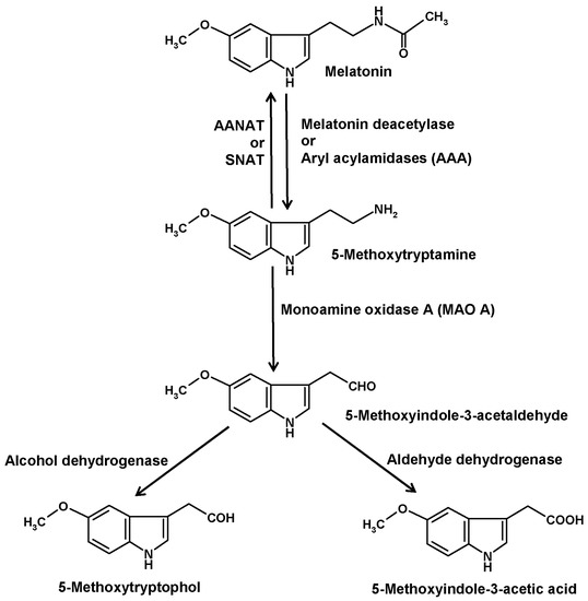 Deacetylation of melatonin has been described for several enzymes. In older literature, such enzymes were generally referred to as aryl acylamidases (AAAs). Moreover, AAA side activities were described for acetylcholinesterase [46], also under the name of AAA-2 [47], and butyrylcholinesterase [48,49,50], but their roles as melatonin-converting enzymes seem to be low or irrelevant. Other AAAs were detected in liver [51,52], brain [47] and pineal gland [53]. However, the brain enzyme did not catabolize melatonin, whereas this was demonstrated for the hepatic isoform [51,52] and, indirectly, for that from the pineal [53]. 5-MT was also shown to appear in the blood after injection of melatonin [52]. In eyes and pineal glands of the European mole (Talpa europaea) [54] and in pineals of Syrian hamsters [55,56], 5-MT had been measured. However, safe determinations required the inhibition of 5-MT catabolism by blocking MAO A [57]. Under such conditions, a circadian rhythm of 5-MT was detected in the hamster pineals [55,56]. This rhythm strongly differed from that of melatonin and was rather reminiscent of the serotonin rhythm. As 5-MT exerted several biological effects, especially in the reproductive system, it was for a while discussed as another pineal hormone [58].