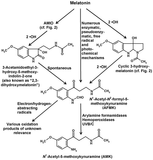 Formation of the kynuric metabolites AFMK and AMK from melatonin. Abbreviation: AMIO, 3-acetamidoethyl-5-methoxyindolin-2-one. For further details of reactions leading to AFMK formation from melatonin see References [29,89,90]. Products from oxidation of AFMK by electron/hydrogen-abstracting radicals have been characterized in Reference [121].