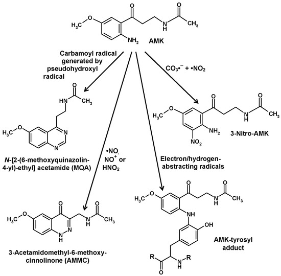 The much higher chemical reactivity of AMK, compared to AFMK, has already been mentioned. This property, which leads to a rapid decay, represents an obstacle for detecting AMK in biological materials. Nevertheless, AMK was convincingly demonstrated in the human skin [63]. AMK efficiently scavenges •OH, CO3•− and peroxyl radicals [90,95,112,130]. The direct products formed by these interactions have not been characterized because they turned out to be unstable and extremely short-lived [29]. However, scavenging of CO3•− in combination with •NO2, which are generated by decomposition of the peroxynitrite-CO2 adduct, resulted in the formation of 3-nitro-AMK [131] (Figure 5). In the latter study, other previously unknown products of interactions of AMK with reactive nitrogen species were identified. AMK was shown to combine with •NO by forming a double-ring compound, 3-acetamidomethyl-6-methoxycinnolinone (AMMC) (Figure 5). Because of the newly formed ring, the adduct is stable [132,133], contrary to other nitroso-aromates including 1-nitrosomelatonin, which re-donates •NO, to compounds that form nitrosamines [132] or oxadiazoles and o-quinone diazides as shown for the structurally related kynurenine-derived metabolites 3-hydroxykynurenine and 3-hydroxyanthranilic acid [134]. AMMC was shown to by also produced from AMK by interactions with the reactive NO redox congeners, NO+ and HNO, the protonated form of NO−, in modifications of the reaction first observed with •NO [133].