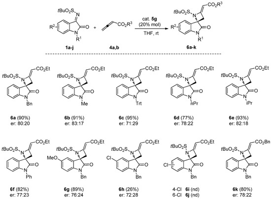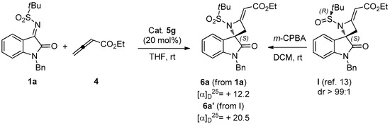 To a solution of the appropriate N-tert-butylsulfonyl ketimine 1a–j (0.10 mmol) and catalyst 5g (0.02 mmol) in THF (1.5 mL), allenoate 4a (or 4b, for spiroazetidine 6k) was added (0.20 mmol). The mixture was stirred at room temperature and the conversion was monitored by TLC. The solvent was evaporated under reduced pressure and the crude was purified by FC, using CH2Cl2/EtOAc 9/1 as eluent.