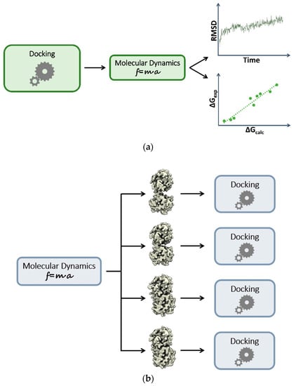 Sequential combination of docking and MD simulations. (a) MD employed for rescoring or refining docking poses; (b) MD employed for conformational ensemble generation. Docking is then performed against multiple rigid receptor conformations.