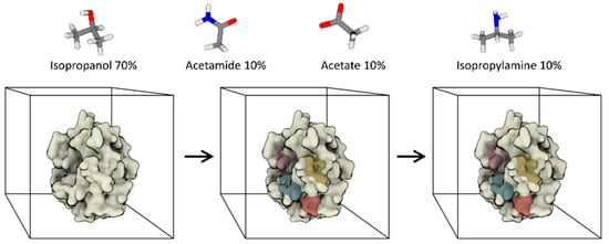 Several approaches have been proposed to address computational de novo design, ranging from the pioneering GRID program developed by Goodford [48], through to the Multiple Copy Simultaneous Search (MCSS [49]) and related methods [50]. Carlson and co-workers recently reviewed these and other approaches [51,52], so we will not discuss them further here. Rather, without aiming to be exhaustive, we will focus on solvent mapping methods, which represent the first application of fully dynamic frameworks to the prediction of protein-ligand interactions (hot-spots). In analogy to the multiple solvent crystal structure (MSCS) method [53], where crystal structures are solved in the presence of multiple organic solvents, solvent mapping algorithms attempt to map the propensity of selected functional groups (probes) to bind the surface of a given target. To do so, simulations are performed with binary or ternary solvent mixtures, and the hot-spots for each probe are identified by measuring the occupancy of volume elements in a Cartesian grid encompassing the entire simulation box (Figure 2).