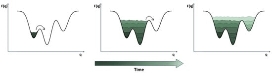 In metadynamics the bias is applied to a CV (q) in order to fill the underlying free energy (F(q)) and discouraging the system to visit already sampled states.