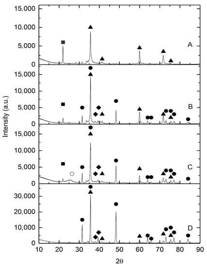 The XRD patterns of nanocomposite samples: (A) β-SiC; (B) (5)WxC-β-SiC; (C) (10)WxC-β-SiC and (D) (20)WxC-β-SiC. Crystalline phases: ▲—β-SiC, ●—WC, ◆—W2C, ■ cristobalite, ○ amorphous carbon. (The numbers in round brackets (5), (10) and (20) show the amounts of W in the catalysts).