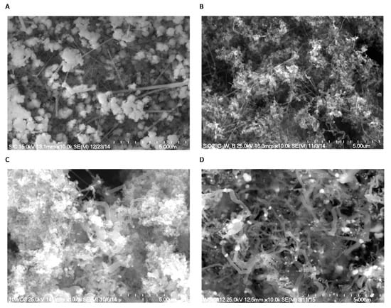 Figure 2A shows a SEM micrograph of a pure β-SiC nanocomposite obtained by thermal reduction of SiO2 by graphitized carbon in an argon atmosphere. The presence of two kinds of β-SiC fibrous whiskers of different lengths and diameters in a range from 40 to 120 nm, as well as β-SiC granular nanostructures, can be observed in the sample. Significantly different morphologies were revealed for the nanocomposites formed from the C, SiO2 and WO3 mixture (Figure 2B–D).