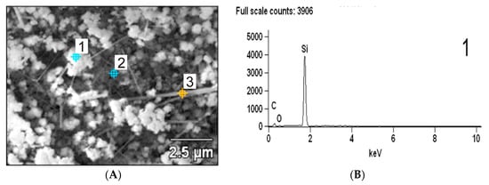 To better understand the chemical composition of the nanostructures in the β-SiC nanocomposites, EDS analysis of selected micro-systems was performed. EDS analysis revealed, that the three areas showed different morphologies (granular structure (point 1); nano-whiskers structure (point 2) and nano-wire structure (point 3) Figure 3A), but the same chemical composition and a small variation of carbon.