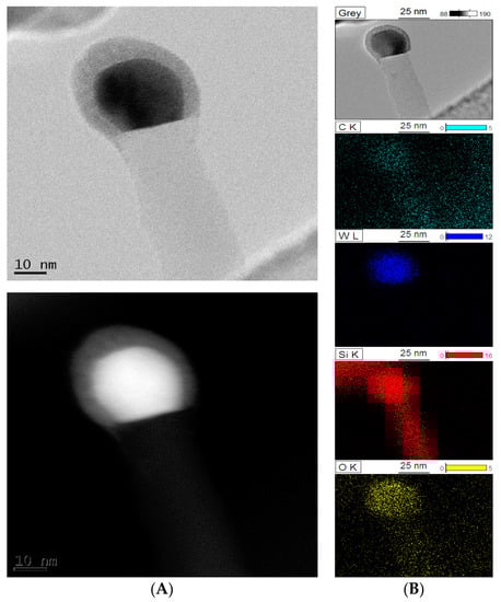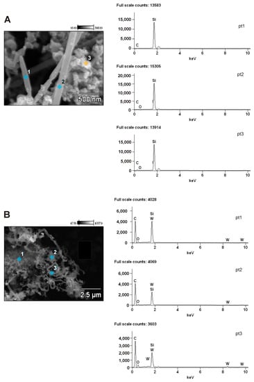EDS analysis of the (5)WxC-β-SiC sample revealed the presence of tungsten homogeneously distributed in the whiskers, but this element was absent from the granular structure (Figure 4A). Increased tungsten content was observed at the tips of the straight whiskers of the (5)WxC-β-SiC nanocomposite (Figure 5). This indicates that the whiskers may have been produced via the vapor-liquid-solid (VLS) mechanism, whereas the liquid W-Si-O-C droplets formed in the reaction mixture and acted as a catalyst for the formation of SiC nano-whiskers [57,58,59,60,61,62,63,64,65,66]. The mechanisms of whisker formation have been discussed in an earlier publication [23].