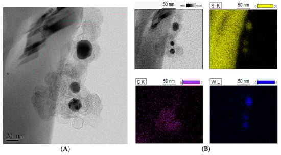 STEM images of a whisker in (10)WxC-β-SiC catalyst: (A) BF-STEM image and BF-STEM image with contrast; (B) BF-TEM image and EDS element maps of the whisker.