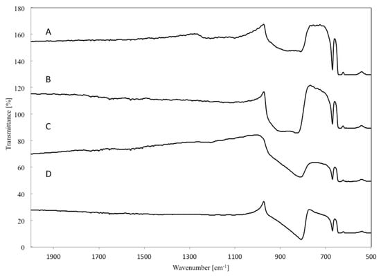 As in the case of pure β-SiC catalyst, FTIR spectra for WxC-β-SiC catalysts containing 5–20 wt % of WO3 in the starting mixture were recorded in the range of 500–4000 cm−1. The corresponding FTIR spectra of the investigated nanocomposites (5)WxC-β-SiC (Figure 8B), (10)WxC-β-SiC (Figure 8C) and (20)WxC-β-SiC (Figure 8D) showed an intense IR absorption band centered at 804 cm−1, which can be attributed to the Si-C vibrational stretching band. The position of this band maximum differed from that observed for β-SiC obtained by the carbothermal reduction of SiO2 without tungsten doping. Possible reasons for this band shift may be the variations in the SiC crystallite sizes in each sample (Table 1), the formation of an amorphous tungsten oxide layer at the interface between the WC and the SiO2 shell (stretching O-W-O vibrations) and Si-C bond deformation at the crystallite surface in SiC nanostructures with different morphologies in β-SiC and WxC-β-SiC. Moreover, the FTIR spectra in Figure 8 B–D show that the addition of W into the system resulted in the complete removal of SiO2 from the samples, as is evident from the absence of its characteristic absorption band in the range from 1090 to 1100 cm−1.