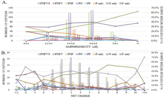 Distributions of antimicrobial activities of AMPs with respect to (A) amphipathicity and (B) net charge. The distribution of the AMPs with specific antimicrobial activities is displayed using a histogram on the left axis, and the percentages of the AMPs with specific antimicrobial activities in the specific range are demonstrated using a line chart on the right axis. Abbreviations: P: anti-gram-positive bacteria; N: anti-gram-negative bacteria; F: anti-fungi; V: anti-viruses; S: anti-parasites.