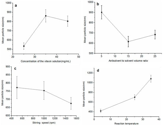 The effect of each factor on the MPS of vitexin particles. (a) concentration of the vitexin solution; (b) antisolvent to solvent volume ratio; (c) stirring speed; (d) reaction temperature.