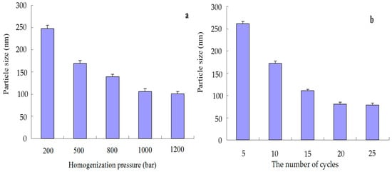 After ASP process is done, the parameters in the HPH process, such as homogenization pressure and homogenization cycles, were further optimized by single factor optimization design (shown in Figure 3). When keeping the numbers of homogenization cycle at 9, the operating conditions of homogenization pressures (200–1200 bar) were optimized, as shown in Figure 3a, increasing homogenization pressure from 200 to 1000 bar, the particle size fell. However, the higher pressure didn’t lead to significant improvement in particle size when the homogenization pressure exceeded 1000 bar. Thus, the optimal homogenization pressure was considered to be 1000 bar in the present experiment.