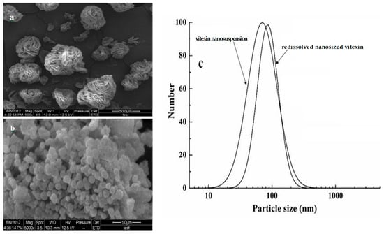 SEM images of raw and vitexin nanoparticles were shown in Figure 4. As shown in Figure 4a, the raw vitexin formed rose-like crystals with particle size distributing between 10 and 70 µm. However, in Figure 4b, vitexin nanoparticles were almost spherical with particle size ranging from 150 to 200 nm. Vitexin nanoparticles were significantly smaller and more uniform than raw vitexin, which indicates better solubility. Figure 4c showed the particle size distribution of vitexin nanosuspensions and redissolved nanosized vitexin. The vitexin nanosuspensions with an MPS of 80.5 nm were obtained under optimum preparation conditions. Compared to vitexin nanosuspensions, the MPS of redissolved vitexin nanopartilces (108 nm) increased slightly. The major reason for this phenomenon may be explained by the agglomeration of vitexin particles during the freeze drying. Furthermore, the zeta potential values of the vitexin particles obtained through ASP and vitexin nanosuspensions with poloxamer 188 as a stabilizer by ASP-HPH were determined as −3.2 and −18.5 mV, respectively. Poloxamers 188, a nonionic linear copolymers with surfactant properties, was often used as stabilizing, solubilizing or emulsifying agents in pharmaceutical formulations of poorly water soluble drugs [24]. In this study, as an efficient steric stabilizer, poloxamer 188 increased the physical stability of vitexin nanoparticles.