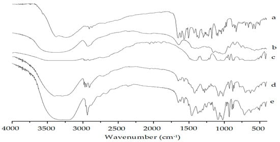 FTIR spectra of (a) raw vitexin; (b) poloxamer 188; (c) mannitol; (d) physical mixture of vitexin; poloxamer 188 and mannitol; and (e) vitexin nanoparticles.