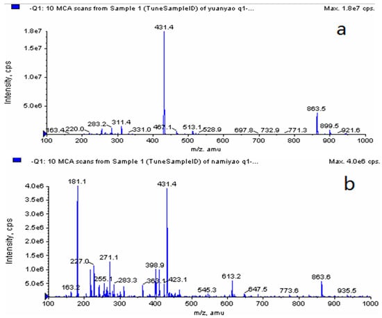 LC-MS spectra of (a) raw vitexin and (b) vitexin nanoparticles.