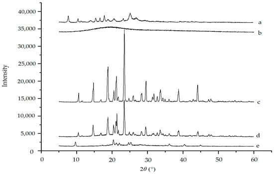 XRPD spectrum of (a) raw vitexin; (b) poloxamer 188; (c) mannitol; (d) physical mixture; and (e) vitexin nanoparticles.
