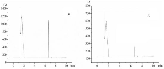 Dimethyl sulfoxide (DMSO), a class 3 solvent with low toxicity in humans, was applied to prepare vitexin particles through the ASP process. Figure 8 showed the GC analysis results of residual DMSO. Seen from Figure 8a, H2O and DMSO were eluted at 1.2 and 6.6 min, respectively. A linear regression equation of peak area (Y) versus DMSO concentration (x) was obtained as Y = 0.7235x − 25.608 (R2 = 0.9988) over the range of 0.2–5 mg/mL. Based on the equation, the amount of residual DMSO in vitexin particles is 1757 ppm, which is much lower than the ICH limit (below 5000 ppm) and is acceptable for pharmaceutical use.