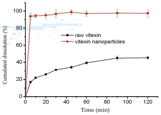 As seen in Figure 9, obvious differences were observed between the two in dissolution curves. Vitexin nanoparticles showed improved dissolution rate as compared to raw vitexin. In the 5 min, the in vitro dissolution rates of raw vitexin and nanoparticles were around 16.85% and 93.94%, respectively. However, at 30 min, dissolution rates of raw vitexin and nanoparticles were found to be around 31.17% and 96.58%, respectively. The accelerated dissolution rate of vitexin nanoparticles could be mainly explained by the particle size reduction, resulting in a significant increase in specific surface area [27,28].