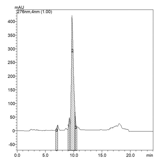 Cellular material was obtained from cultures after centrifugation and lyophilization of the pellet. Dried cells from each strain were extracted with aqueous 75% methanol. The material was centrifuged at 4000× g for 6 min at 4 °C. The supernatant was collected. Analyses were performed on a Shimadzu Prominence semi-preparative HPLC instrument (Shimadzu, Kyoto, Japan). Separations were achieved using a Luna C18 column (250 mm × 3 mm, 5 μm; Phenomenex®, Torrance, CA, USA) protected with a guard column of the same material. Samples were eluted using mobile phase A (water, 0.05% trifluoroacetic acid) and mobile phase B (acetonitrile, 0.05% trifluoroacetic acid). The analysis was conducted on a gradient according to the methodology described by Lawton et al. [21]. Chromatograms were monitored at 276 nm λmax and from 200 to 700 nm in the DAD detector.