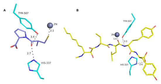 Molecular docking studies were performed in order to investigate the possibility of an interaction between MG770 with the active site of ACE. Knowing that MG770 inhibits ACE, the distances of the major interactions in the active site of the enzyme suggest the mechanism of action. The best docking pose of MG770 obtained from the docking studies showed the same interactions than captopril in the active site of the ACE. The crystal structure of the ACE co-crystalized as captopril (PDB: 2X8Z) can be observed from the interaction between the sulphur atom from captopril and zinc, with distances of 2.1 Å (Figure 5A). Docking studies showed an interesting interaction between zinc and the carbonyl homotyrosine, from microginin, at 1.6 Å (Figure 5B). These results suggest an interaction between zinc and molecules (captopril and MG 770), because the carbonyl and thiol are isosters. On the other hand, the residues Tyr507 and His337 show a hydrogen bond with captopril and microginin (Figure 5), and the rings from captopril and tyrosine from microginin were located in the S2-pocket of the ACE (Figure 6); this suggests molecular complementarity in the active site of ACE.