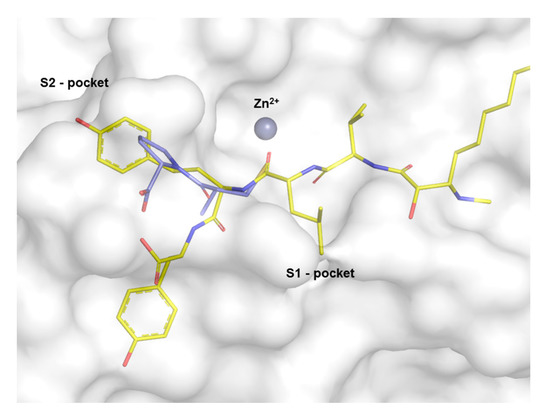 Comparison of captopril crystal structure shown in blue (PDB: 2X8Z) with MG 770 shown in yellow, with regard to cash-outs zinc atom.