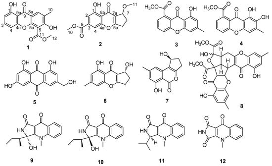 By comparing the 1H, 13C NMR and MS data with the literature values, the known compounds were identified as 8-hydroxy-6-methyl-9-oxo-9H-xanthene-1-carboxylic acid methyl ester (3) [9], 7,8-dihydroxy-6-methyl-9-oxo-9H-xanthene-1-carboxylic acid methyl ester (4) [10], 1,6,8-trihydroxy-3-(hydroxymethyl)anthraquinone (5) [10], coniochaetone B (6) [8,10], citrinolactone B (7) [11], epiremisporine B (8) [7,12], quinolactacins C1 (9) [13,14,15], C2 (10) [13,14,15], and B (11) [16], and quinolonimide (12) [15]. The stereochemistry of 6, 7, 9 and 11 was confirmed by the optical rotation, and comparison with literature values. Compound 10 was obtained as a mixture of quinolactacins C1 and C2. The configurations of the compound 8 were not determined.
