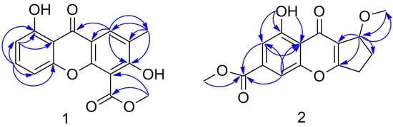 Compound 1 was isolated as white amorphous solid. Based on the HRESIMS ion peak at m/z 299.0569 [M − H]− (calcd. for 299.0561), the molecular formula was established as C16H12O6 indicating eleven degrees of unsaturations (Figure S5). The 1H NMR spectrum of 1 showed characteristic signals for three vicinal protons as an AMX spin system at δH 6.80 (1H, dd, J = 0.7, 8.5 HZ, H-4), 7.05 (1H, dd, J = 0.7, 8.5 HZ, H-2), 7.72 (1H, t, J = 8.5 HZ, H-3), and one olefinic proton at δH 7.57 (1H, d, J = 1.0 HZ, H-8) (Figure S1). Additionally, one intramolecularly hydrogen-bonded hydroxyl group at δH 12.32, a methoxy singlet at δH 3.87 and an aromatic methyl singlet at δH 2.38 were observed. The 13C NMR data of 1, with the aid of DEPT and HSQC experiments (Table 1, Figures S2 and S3), showed resonances for two methyl groups (one methoxy), twelve aromatic carbons with four protonated, one carboxylic carbon (δC 167.0), and one α,β-unsaturated ketone carbon (δC 180.5). These data showed great similarities to those of 2,8-dihydroxy-3-methyl-9-oxoxanthene-1-carboxylic acid methyl ester [6] with the difference in ring C. The HMBC correlations of H-8 to C-6, C-5a, C-8a, and C-9, CH3-12 to C-11 and C-5, CH3-10 to C-6, C-7 and C-8 revealed that a phenolic OH was attached to C-6 and a carboxymethoxy moiety was attached to C-5 (Figure 2 and Figure S4). The positioning of the phenolic OH at C-6 was further supported by the base peak observed at m/z 268 [M+ − MeOH] (Figure S8), as previously illustrated for 2,8-dihydroxy-3-methyl-9-oxoxanthene-1-carboxylic acid methyl ester [6]. Thus, compound 1 was suggested to be 1,6-dihydroxy-7-methyl-9-oxoxanthene-5-carboxylic acid methyl ester.