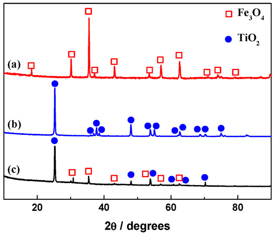 Recently, magnetic titania has gained increasing attention, as it has the advantages of magnetic recovery and excellent photocatalytic properties [15,16,17,18,19]. They can achieve the fast separation and easy recovery of nano-TiO2 by external magnetic fields, thus preventing the loss of active components and improving the durability of catalysts. Also magnetic titania can reduce the cost incurred by ultrafiltration or centrifugation, which is used to recover the power photocatalyst [20]. Fe3O4, as a ferrite magnetic material, has strong magnetic properties and can be used as a carrier to prepare magnetic TiO2 photocatalyst that can be effectively separated and recovered with the help of an external magnetic field [21,22]. S. Khashan et al. used a modified sol-gel method to prepare Fe3O4@TiO2 core/shell nanoparticles, which exhibited excellent magnetic separation and targeting [21]. W.-F. Jiang et al. combined sol-gel and simple hydrothermal methods to construct a magnetic composite of Fe3O4@TiO2 core-shell microspheres supported by silica aerogels, which possessed good photocatalytic activity and excellent magnetic properties, enhanced charge separation efficiency and strong light absorption in the visible region [22]. Meanwhile, the Fe3O4/TiO2 composite can reduce the band gap of TiO2 and extend the adsorption wavelength range to the visible region, which further improves the photocatalytic activities [23]. Moreover, almost all of the titanium sources used are expensive organic or inorganic raw materials, and the procedure for preparing magnetic titania often requires rigorous reaction conditions, hence limiting its application. Also the magnetic properties are often influenced by a multilayer coating and high temperature calcinations, thus affecting the photocatalytic efficiency [24]. Therefore a facile approach to the low cost preparation of the magnetic titania nanocomposite at relatively low temperatures is highly desired.