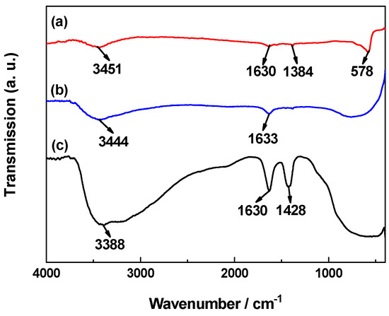 Figure 3 shows the FTIR spectra of Fe3O4 magnetic powder, TiO2 and the Fe3O4/TiO2 nanocomposite. In these spectra, the large and broad absorption peak near 3400 cm−1 is related to the stretch region of the surface hydroxyl groups with hydrogen bonds and chemisorbed water [30,31,32]. The absorption peak near 1630 cm−1 can be assigned to the O–H bending of molecularly physisorbed water [31,32]. In curve a of Figure 3, the absorption peak at 578 cm−1 can be attributed to the formation of the Fe–O bond [33], and the characteristic absorption peak of carbonyl group at 1384 cm−1 was derived from the addition of oleic acid during the preparation process of magnetic fluid. In curve b of Figure 3, the large absorption in the range of 600 cm−1 to 800 cm−1 is characteristic of the formation of an O–Ti–O [30]. In the FTIR spectrum of the Fe3O4/TiO2 nanocomposites, the presence of an absorption peak at the range of 600 cm−1 to 800 cm−1 and the absence of the characteristic peaks of Fe–O at 578 cm−1 indicate that the Fe3O4 magnetic cores were completely coated with TiO2 layer. And the absorption peak at 1428 cm−1 corresponding to the –CH=CH– vibration may be due to the incorporation of a small amount of oleic acid in the product. The above results indicate that a small amount of organic molecules were encapsulated into the Fe3O4/TiO2 nanocomposites, which helps to protect the Fe3O4 magnetic core, eliminates the photodissolution [34] and improves the photocatalytic activity and stability.