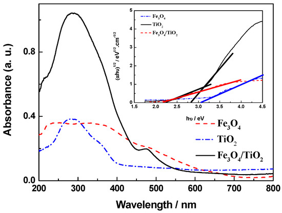 UV-Vis diffusion reflection spectra and plots of (αhν)1/2 versus the photon energy (hν) curves (inset) of Fe3O4 magnetic powder, TiO2, and Fe3O4/TiO2 nanocomposite.