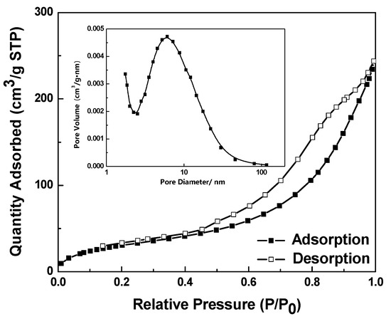 Figure 5 presents the nitrogen adsorption and desorption isotherms and pore size distribution of the Fe3O4/TiO2 nanocomposite. The BET specific surface area was 119.26 m2·g−1. As shown in the inset of Figure 5, the pore diameter distribution was measured by the Barret-Joyner-Halenda (BJH) method and the pore size was about 6.1 nm. It may be that the accumulation of a large number of particles with the size of about 25 nm leads to the porous properties. Therefore, the synthesized Fe3O4/TiO2 nanocomposite with porous structures would potentially exhibit excellent photocatalytic properties.