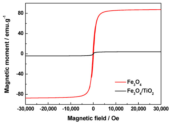 The magnetic measurements of Fe3O4 magnetic particles and the Fe3O4/TiO2 nanocomposite are displayed in Figure 6. There was no obvious hysteresis for any of the samples, indicating the superparamagnetic behavior at room temperature. The saturation magnetization was measured to be 87.325 emu·g−1 for Fe3O4 magnetic particles and 4.180 emu·g−1 for Fe3O4/TiO2 nanocomposite. The TiO2 coating has a shielding effect on the magnetic field and hinders the magnetization effect of the Fe3O4 magnetic core. After the coating of the TiO2 shell, the nanocomposite exhibited a low saturation magnetization, but it could still be quickly separated and easily recovered by applying an external magnetic field. The separation and recovery of photocatalysts assisted by magnetic technology is easier to apply than the traditional filtration and centrifugation, exhibiting promising potential in large scale industrial applications.