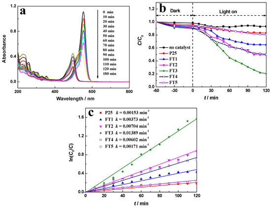 (a) Absorption spectra of 5 × 10−5 mol/L Rhodamine B (RhB) solution in the presence of FT3 under visible light irradiation at different irradiation times denoted by the different color lines; (b) degradation rate of RhB at the different intervals; and (c) ln(C0/C) versus t curves in the presence of various photocatalysts.