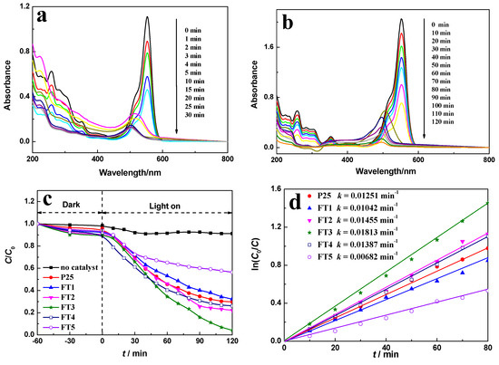 (a,b) Absorption spectra of (a) 5 × 10−5 mol·L−1 and (b) 20 × 10−5 mol·L−1 RhB solutions in the presence of FT3 under solar light irradiation at different irradiation times denoted by the different color lines; (c) degradation rates of RhB solution corresponding to (b) at the different intervals; and (d) ln(C0/C) versus t curves in the presence of various photocatalysts.