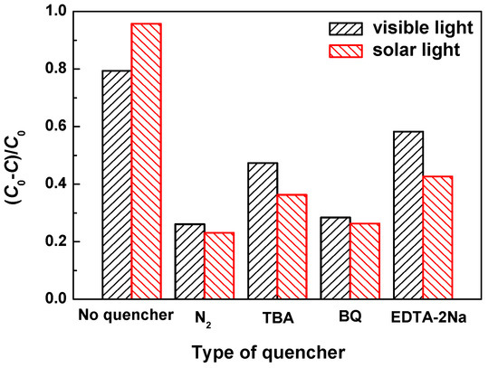 To investigate the active species involved in the photocatalytic reaction, a series of quenching tests were carried out by the addition of a scavenger to the reaction system. Tert-butyl alcohol (TBA, 1 mmol·L−1), benzoquinone (BQ, 1 mmol·L−1) and disodium ethylenediaminetetraacetate dehydrate (EDTA-2Na, 1 mmol·L−1) were selected as the scavengers of hydroxide radicals (·OH), superoxide radicals (·O2−) and photogenerated holes (h+), respectively.