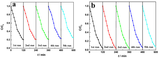 Recycle curves of FT3 for the degradation of the (a) 5 × 10−5 mol·L−1 RhB solution under visible light irradiation and the (b) 2 × 10−5 mol·L−1 RhB solution under solar light irradiation.