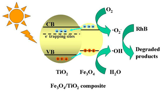 The schematic diagram of the proposed photocatalytic mechanism of RhB for Fe3O4/TiO2 nanocomposite.