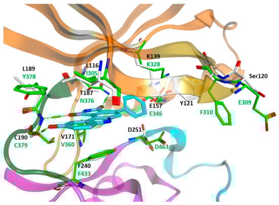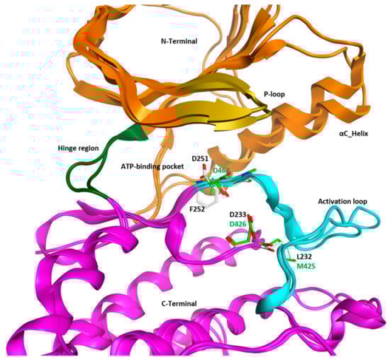 - Vulpetti, A.; Bosotti, R. Sequence and structural analysis of kinase ATP pocket residues. Farmaco 2004, 59, 759–765. [Google Scholar] [CrossRef] [PubMed]