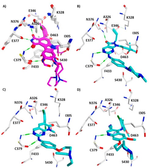 - Zuccotto, F.; Ardini, E.; Casale, E.; Angiolini, M. Through the “gatekeeper door”: Exploiting the active kinase conformation. J. Med. Chem. 2010, 53, 2681–2694. [Google Scholar] [CrossRef] [PubMed]