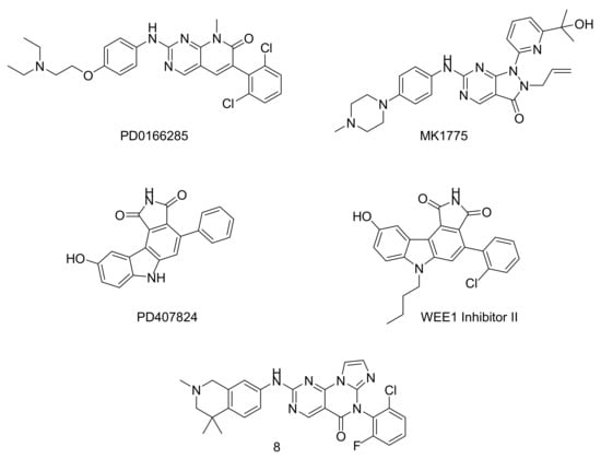 For WEE1, five compounds reviewed as inhibitors are represented in Figure 5 [81]. PD0166285 is the first compound that has been reported with an inhibitory activity against WEE1. It is a non-selective 6-aryl-pyrido[2,3-d]pyrimidine derivative active in a nanomolar range (IC50 = 24 nM) on WEE1, but is also active on PKMYT1 and a range of other kinases including c-Src (C-terminal Src kinase), EGFR (epidermal growth factor receptor), FGFR1 (fibroblast growth factor receptor 1), CHK1, and PDGFRb (Beta-type platelet-derived growth factor receptor) [82]. PD0407824, a staurosporine analogue, with an IC50 of 97 nM on WEE1 was more active on CHK1. Optimization of PD0407824 resulted in the discovery of WEE1 inhibitor II, which bears two additional substituents (Figure 4). This compound is more selective against CHK1; however, it showed no activity in cells due to its low solubility and cell permeability. Optimization of WEE1 inhibitor II was attempted, but led to no significant improvement. MK1775 is the first highly potent and selective WEE1 inhibitor (IC50 = 5 nM). It was discovered by Merck laboratories through the optimization of an high troughput screening (HTS) hit. MK1775 activity is selective towards p53 defective cells and has no effect on p53+ cells. MK-1775 is the most potent and highly selective inhibitor of WEE1 and has recently reached phase I clinical trials. Lastly, a pyrimidine-based tricyclic molecule was proposed in 2015 by AbbVie for the inhibition of WEE1. This molecule (8) was designed by a rational hybridization between MK1775 and other WEE1 inhibitors as a most promising molecule, rendering this compound promising for further preclinical evaluation.