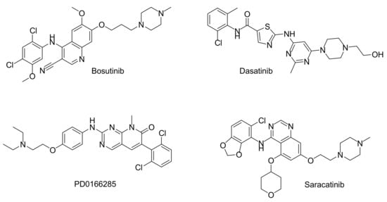 For PKMYT1, only nine inhibitors were published as active, and included among them were drugs like the tyrosine kinase inhibitors Dasatinib (IC50 = 130 nM) and Bosutinib (IC50 = 350 nM), as well as the pyridopyrimidine derivatives PD0166285 (IC50 = 7.2 nM), PD1739525, PD1739552, and PD1809705 [83]. Furthermore Pelitinib, Saracatinib, and Tyrphostin AG14784 seem to be weak inhibitors (Figure 6). When comparing the number and strength of PKMYT1 inhibitors with other kinases, PKMYT1 appears to be restricted and difficult to inhibit. This is particularly evident by the selectivity score for PKMYT1 given by Davis et al., with 0.0417 at 3 μM inhibitor concentration [84]. Thus, only 4.17% of the tested compounds inhibit PKMYT1—a fact that is true for only 2% of all tested kinases generally. None of the potential PKMYT1 inhibitors reached clinical trials until now.