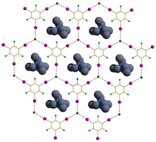 As a part of an ongoing project aimed at changing the composition of multi-component and self-assembled systems, while maintaining unmodified their supramolecular characteristics [31], we were interested in identifying cases where the change of the anion in 3a,b preserves all the supramolecular characteristics described above, and decided to co-crystallize 1 with Et4N+Br− and Et4P+Br− (2c,d) (Scheme 1). We reasoned that the formation of (6,3) networks 3c,d from 1 and 2c,d is quite likely while the hexagonal frames having bromide anions at three of their vertexes should be smaller than analogous frames having iodide anions (I∙∙∙Br− bonds are typically shorter than I∙∙∙I− bonds), the used onium cations would comfortably fit also in the smaller cavities formed by bromide anions as tetraethyl onium cation is safely below the cation upper size limit for the formation of (6,3) nets based on the I∙∙∙I− supramolecular synthon. Here, we report that the connectivity and the topology in the adducts 3c,d (afforded by 1 and 2c,d) is the same as in 3a,b (Figure 1).